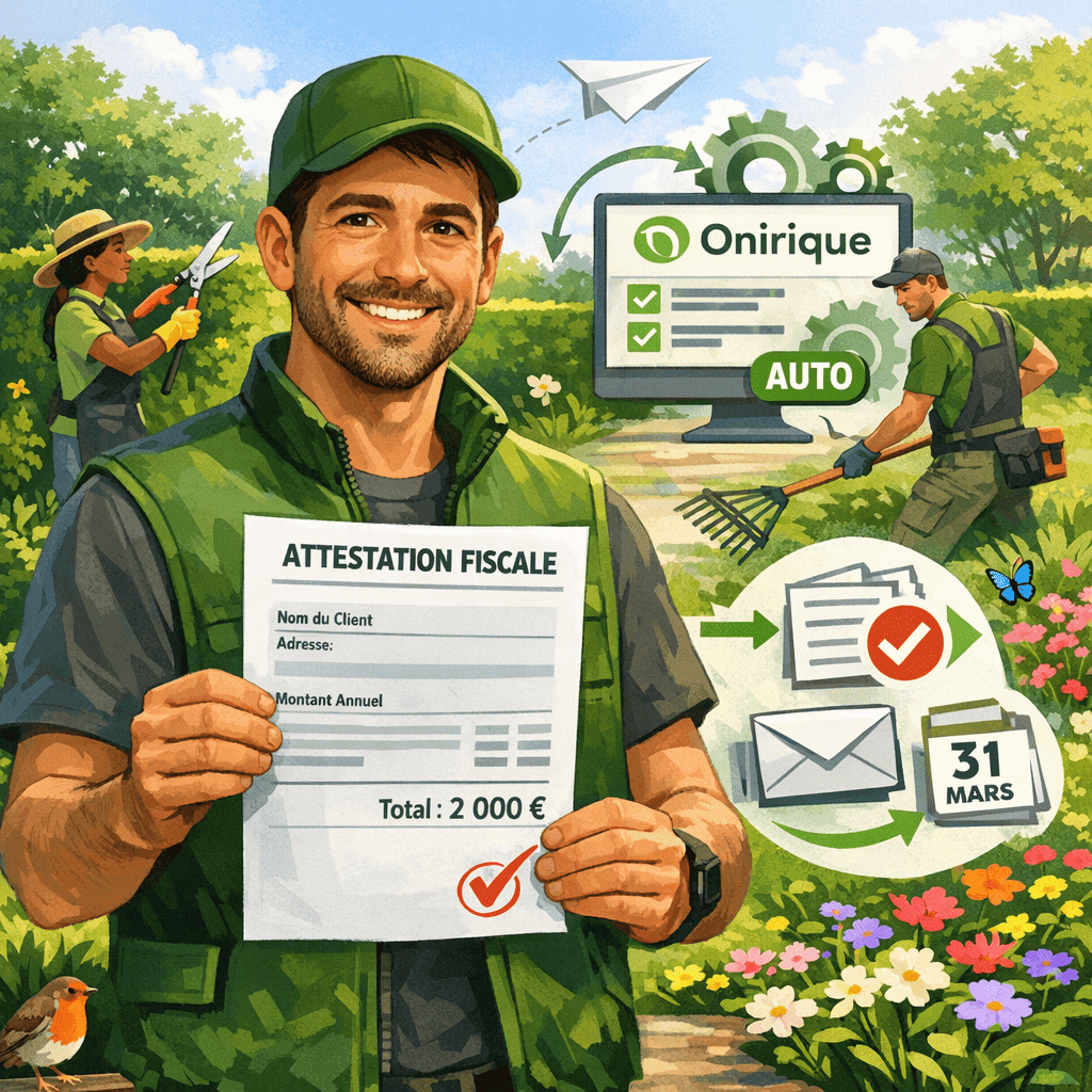 L’attestation fiscale est un document essentiel dans le cadre du crédit d’impôt pour l’entretien du jardin. Elle permet au client de justifier les dépenses engagées auprès de l’administration fiscale. Pour les professionnels, sa production fait partie des obligations liées aux services à la personne. Chez Onirique, cette étape administrative est automatisée afin de simplifier la gestion des paysagistes.